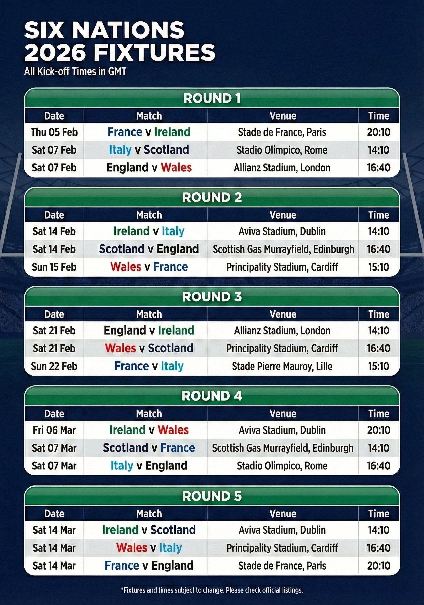 - Sat 14 Feb — Scotland v England, Scottish Gas Murrayfield, Edinburgh, 16:40