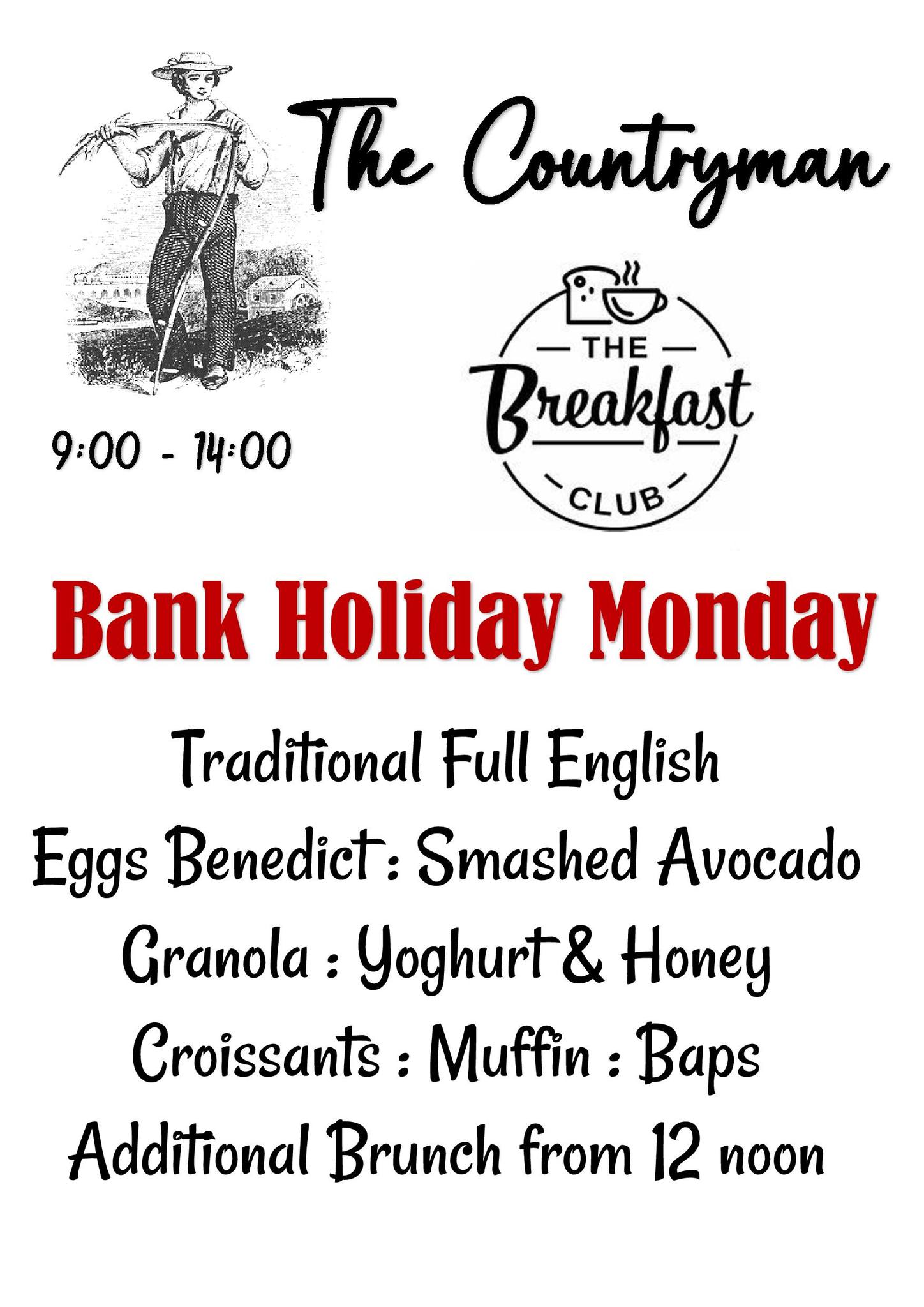 Why not pop down to The Countryman on Monday 6th April for The Full Monty, or just grab a coffee & croissant, maybe smashed avocado on toast, plenty of choices and GF options.