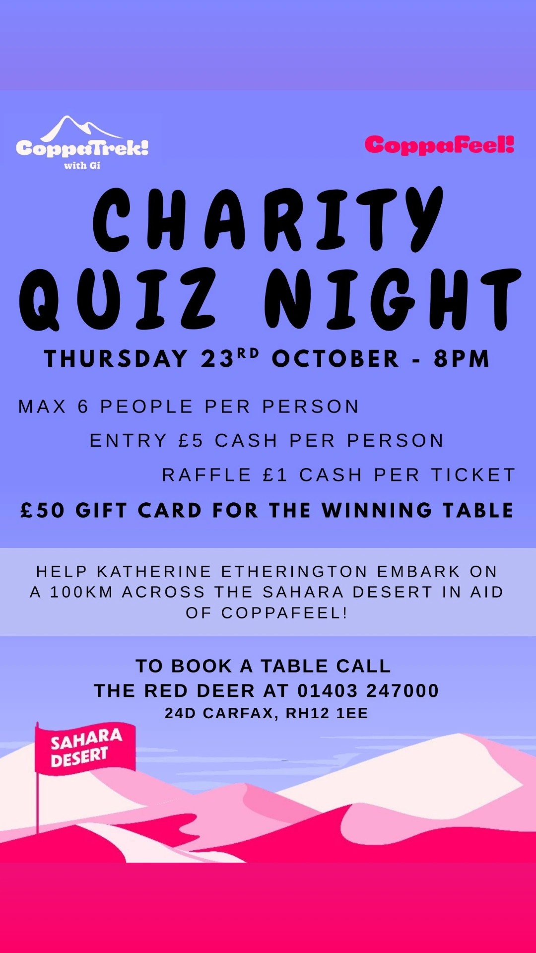 Raising money for Katherine Etherington to embark on a 100km trek across the Sahara desert in aid of Coppafeel.