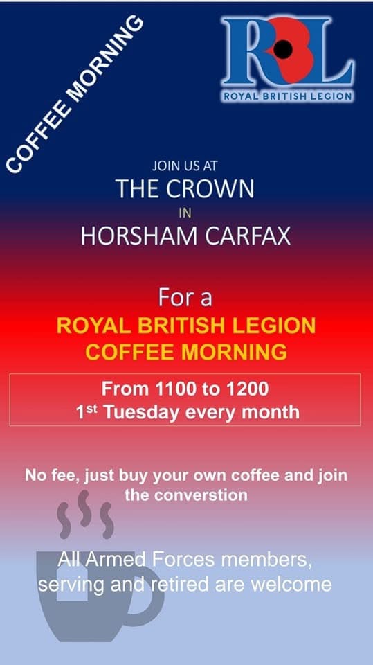 Horsham RBL are very grateful to the staff at The Crown for hosting our coffee hour on the 1st Tuesday of every month.