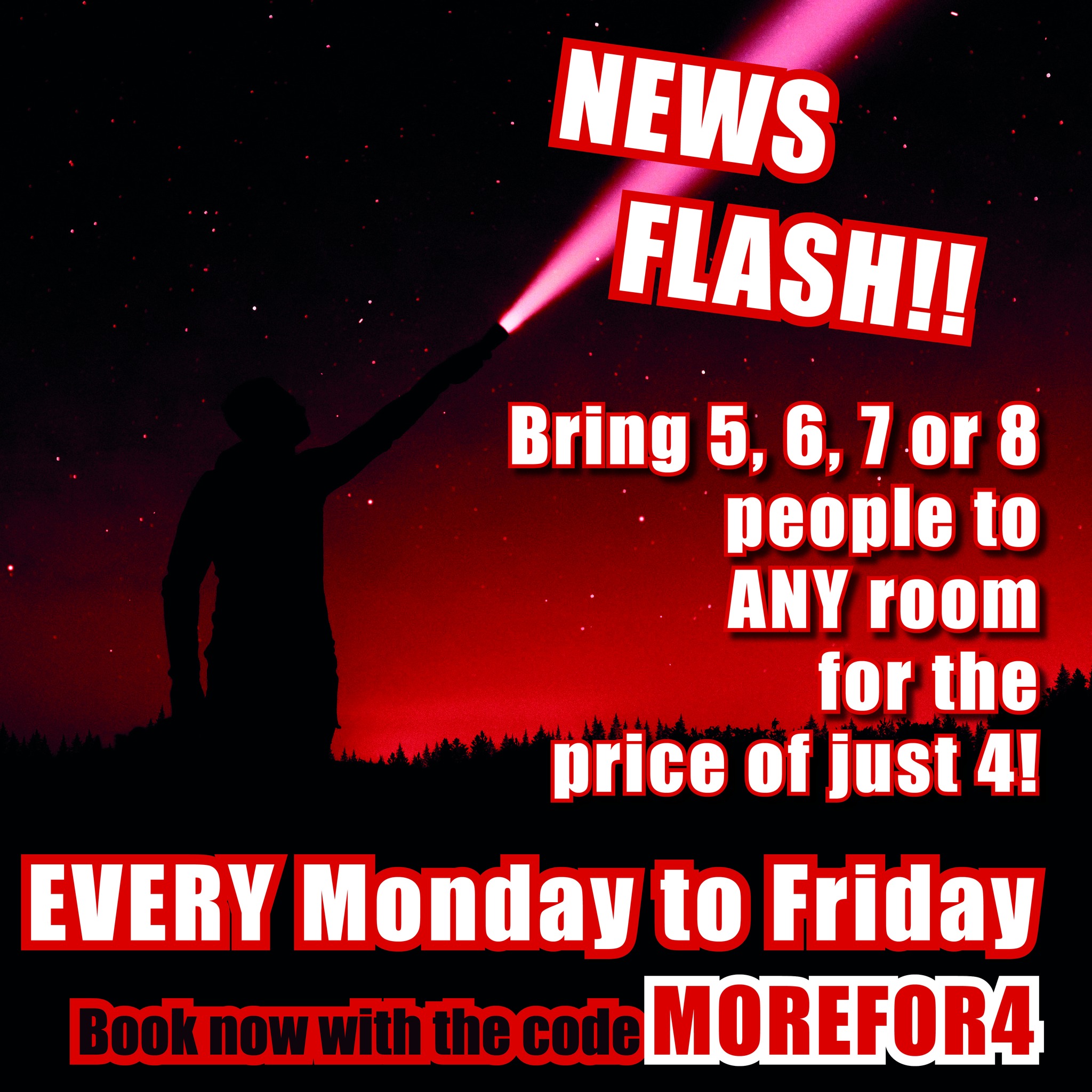 We’re actually closing on 6 May to celebrate, but we’re running an offer from 5 May until 8 May 2023 whereby if anyone books a game for four people or more on any of those days they can get 30% off their booking using the promocode CHARLIE. The promocode will only work those days, however people can book for any time they like in the future, including any of the May bank hols.