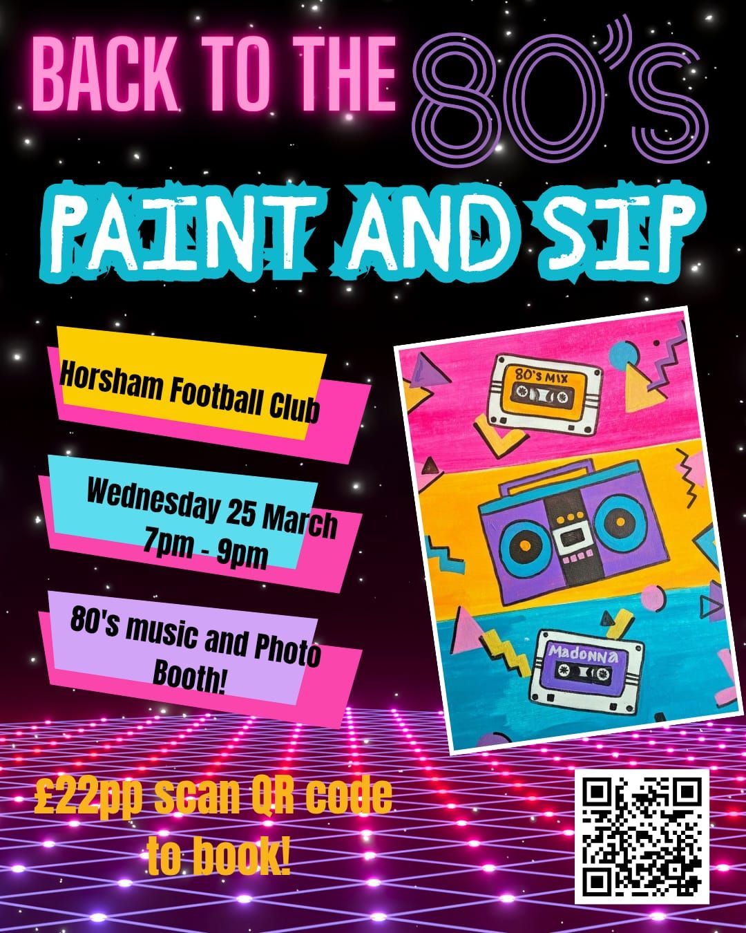 Join us at Horsham Football Club for a wonderful night of 80s music, while enjoying a lovely drink, and painting your very own 80s-inspired picture.