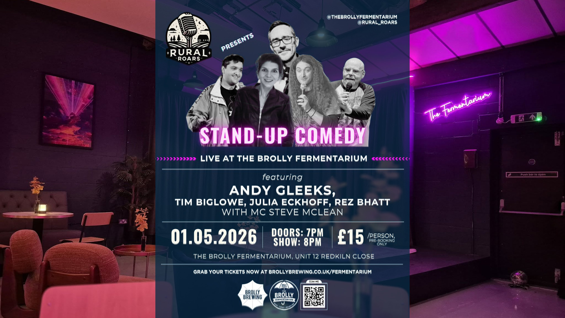 Why trek to the city for a laugh when the best comedy is coming to your doorstep? Rural Roars is thrilled to bring a world-class lineup to the unique surroundings of the Brolly Fermentarium.