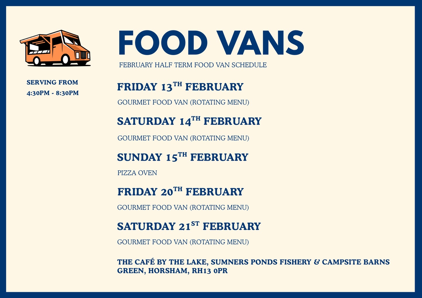 This half term, a selection of food vans will be joining us lakeside for a series of relaxed evenings.