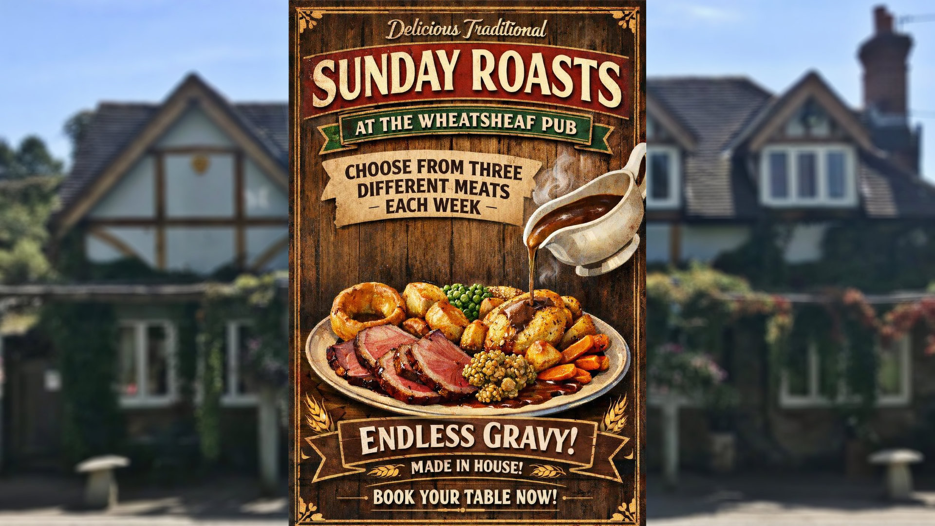 Join us at The Wheatsheaf for delicious traditional roasts, with three different meats to choose from every week and our famous endless, homemade gravy.