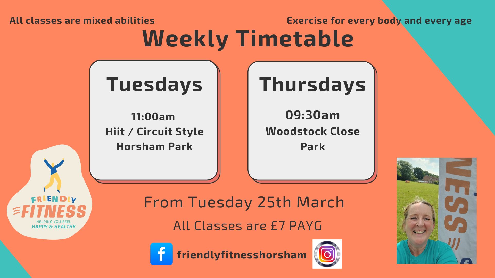 Tuesdays - 11am in Horsham Park - Join me for a Hiit / Circuit style session. All exercises can be scaled up or down depending on your fitness level and how hard you want to work.